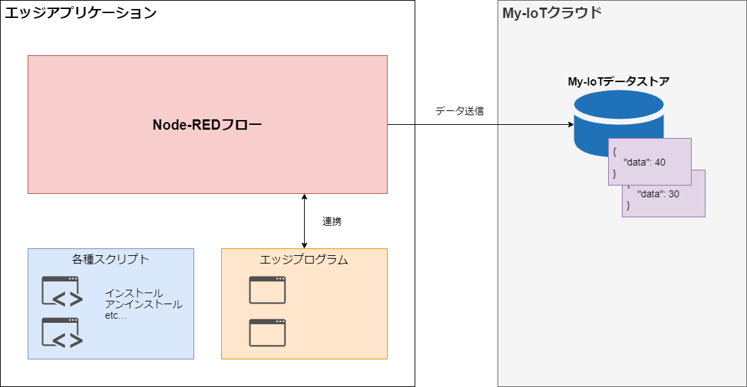 My-IoTで構築できるシステムの基本的なアーキテクチャとしては、エッジアプリケーション、クラウドアプリケーション、My-IoTデータストアの3つから構成されます。