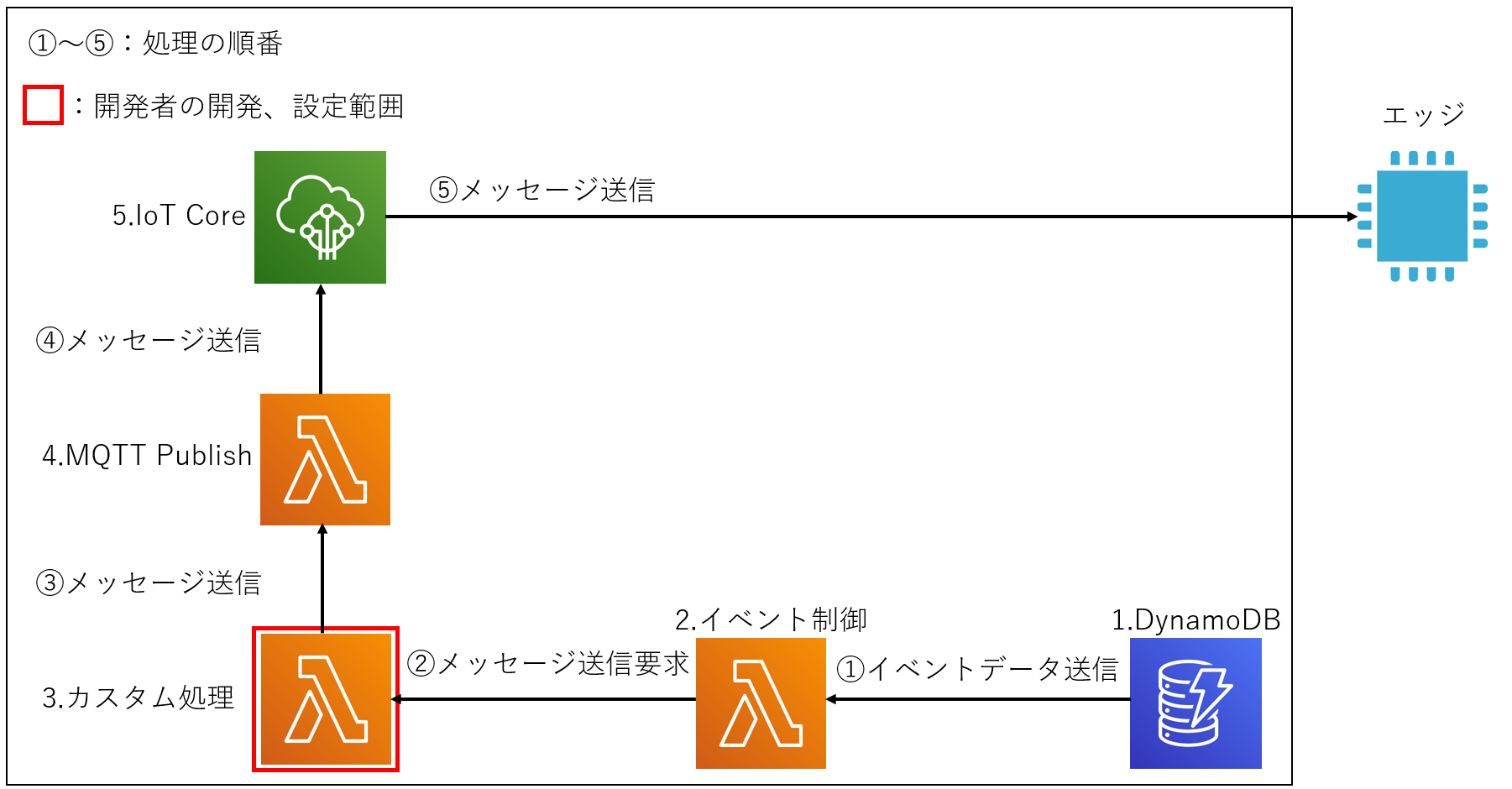 イベント制御Lambdaからイベント情報を受け取り、イベントに基づいてIoT Coreへのメッセージ送信Lambdaを呼び出します。 |